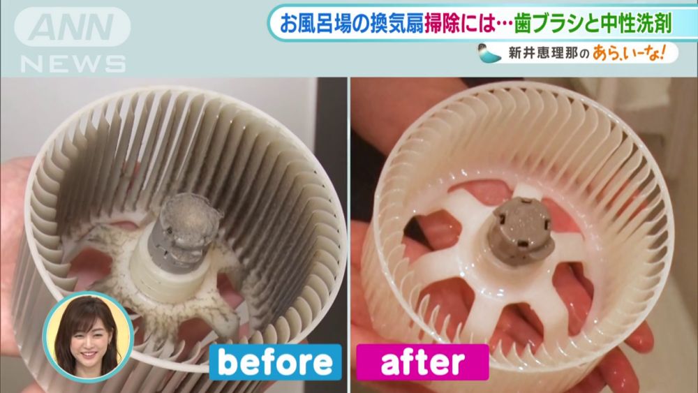浴室的濕氣較高,抽氣扇最容易黏附了灰塵,容易滋生霉菌,必須要小心清潔!部分抽氣扇不能自行拆卸扇葉及部見,簡單用牙刷從風扇上刮除灰塵及污垢即可,但如果抽氣扇可以拆除,可以參考上原好志子的清潔方法。