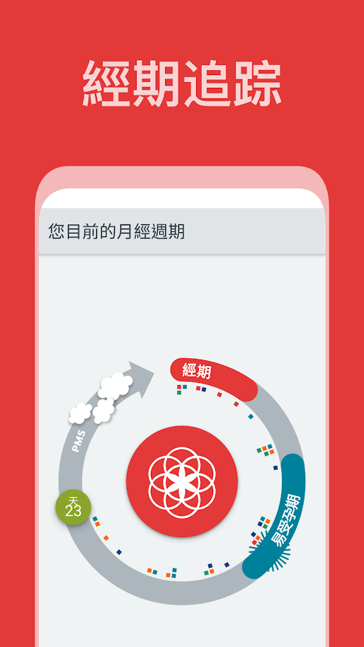使用者一開始可以選擇3項功能,追蹤月經週期、懷孕管理,以及記錄懷孕期等,選擇完自己需要的功能後就需要回答數條問題,例如上一次月經何時到來,長度是多少等,回答問題後app就會自動計算出下次經期大約到來時間,以及懷孕機率等。除了經期外,更可以記錄每天體重、喝水量、性生活、心情等,全面管理身體健康。