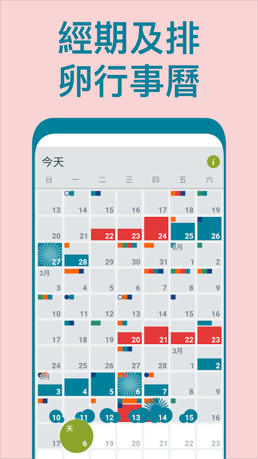 Dot Fertility Tracker是屬於避孕導向的月經追蹤app,只要輸入月經開始及結束時間,它就會自動計算出下次生理週期,若懷孕機會率高的日子更會彈出通知,版面以簡約點點設計,簡單易明。