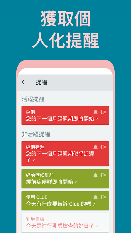 Clue一樣是月經週期的追蹤app,回答相關問題後一樣會自動計算出下一次週期,懷孕機率等,但Clue可以給使用者更詳細的選擇,例如出血量、疼痛感、經期前後情緒等,當Clue完成至少一個月的記錄後,更會製作出月經週期報告,方便你告知你醫生詳細資料。